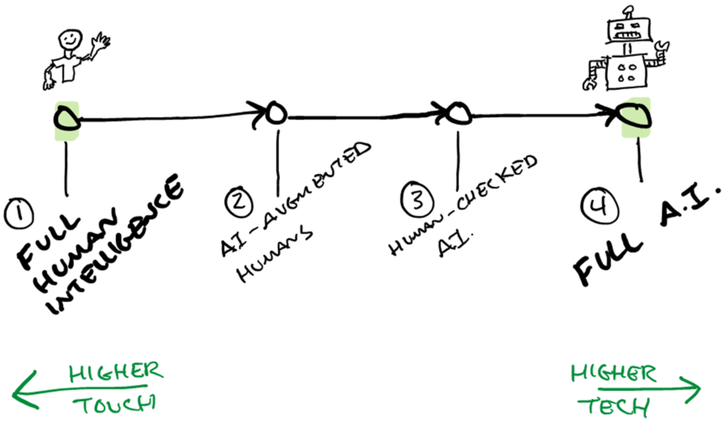 Phase 3: Human-augmented (human-checked) AI – Over time, this shifts to AI being the primary means of doing the work with human’s there to correct the AI’s mistakes.