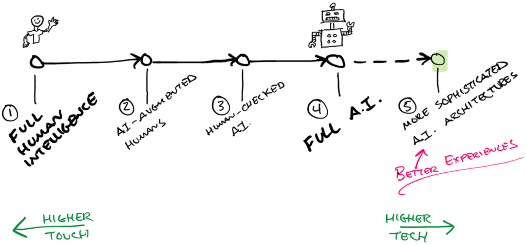 This progression improves scalability, with the human touch going away, the user experience diminished in the later phases. However, it unlocks new possibilities.
