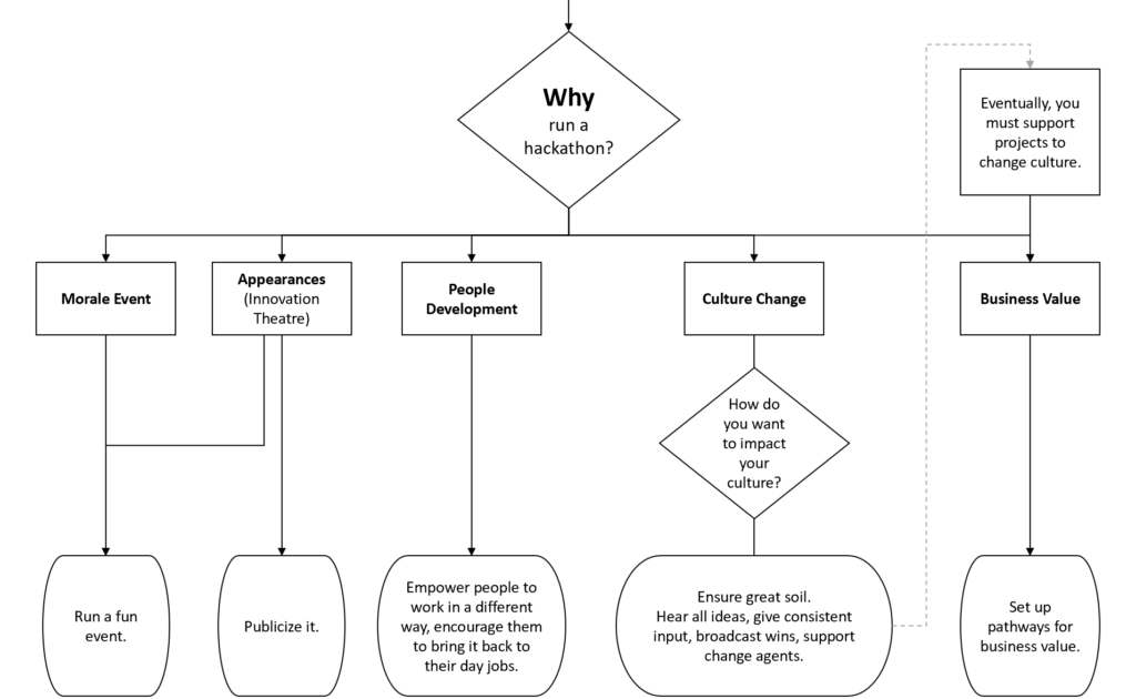 If you’re doing this to show your team you’re listening or show the outside world you’re into the hacking thing, that’s relatively easy, too. Note though, this is commonly known as innovation theatre. Just be aware when you do this, it can boomerang back on you. People may get frustrated if nothing comes out of your hackathon. However, if this is your only goal, go ahead and run a great event, and then publicize the heck out of having done it to maximize your credit. You may incidentally get some longer-term value, too, that you can capture and talk about. When it comes to appearances, long-term value looks even better.