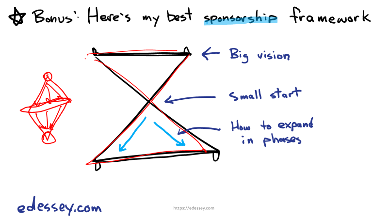 As a bonus, here’s a framework that I coach for constructing an argument for sponsorship. It is to follow an hourglass shape. Begin with a big vision, then step down to how you will start in a focused way, then share how you can execute in phases from the start to the big vision. This shape, when presented to sponsors, shows that the person seeking sponsorship is both strategic and practical. As a coach, helping a team organize their thoughts into this pattern, gives them a clear view on how to compel a sponsor.